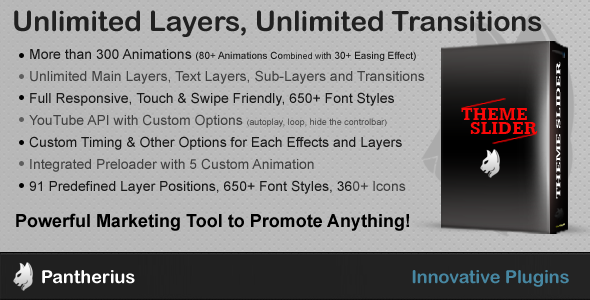 Modern Touch-Enabled FullScreen Slider with Unlimited Layers and Animations. Lot of customizable options, including timing, controlbar position and color for each slider. 91 predefined layer positions, 650+ Font Styles, more than 30 Text Animations with 10+ unique sublayer animations and 10+ main slider animations provides a very powerful marketing tool for your website. The main Slider transitions using the latest CSS3 animations with Hardware Accelerated method. The Key Features also contains a custom YouTube video support with more options, than the default YouTube iframe embedding code. You can hide the controls, start the video automatically with no sound or resize to fit the screen.